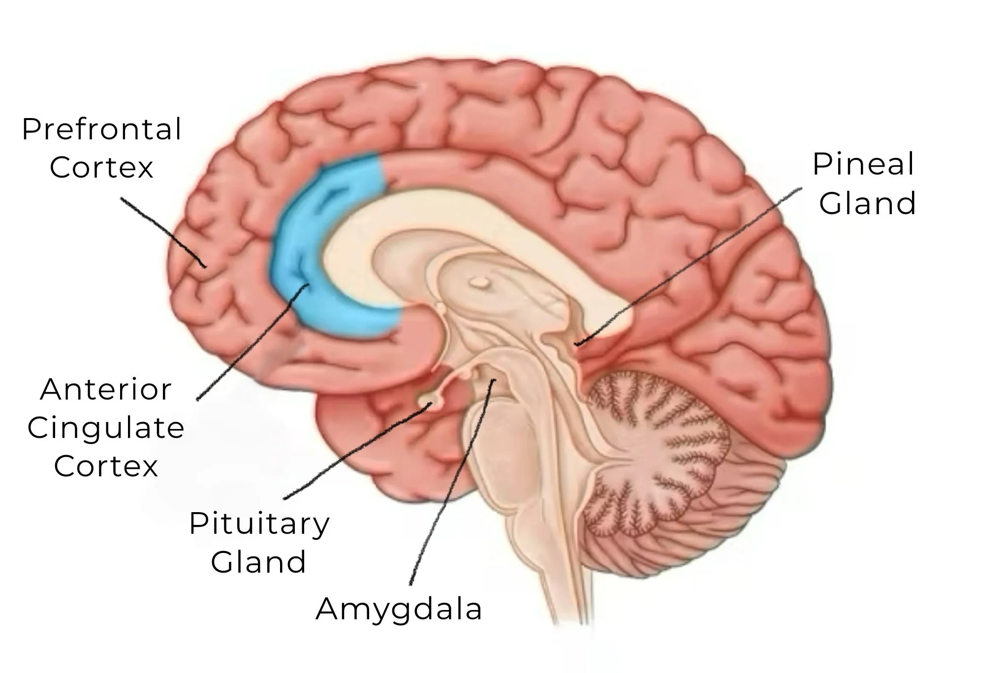 Anxiety: Anxiety combines heightened activity in the amygdala with overactivation of the prefrontal cortex, as the brain tries to assess and mitigate threats. It also engages the hypothalamus and pituitary glands, releasing cortisol and adrenaline. This leads to increased heart rate, altered heart rhythms, and imbalances in neurotransmitters like serotonin and GABA, all of which impact mood regulation.